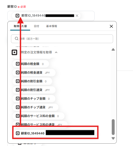 顧客IDはステップ4で取得した値を活用し、以下のように設定してください。
