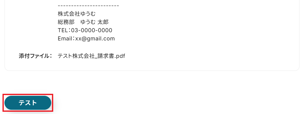 メール送信のテスト画面に移るので、内容に誤りがないか確認してテストしてください。