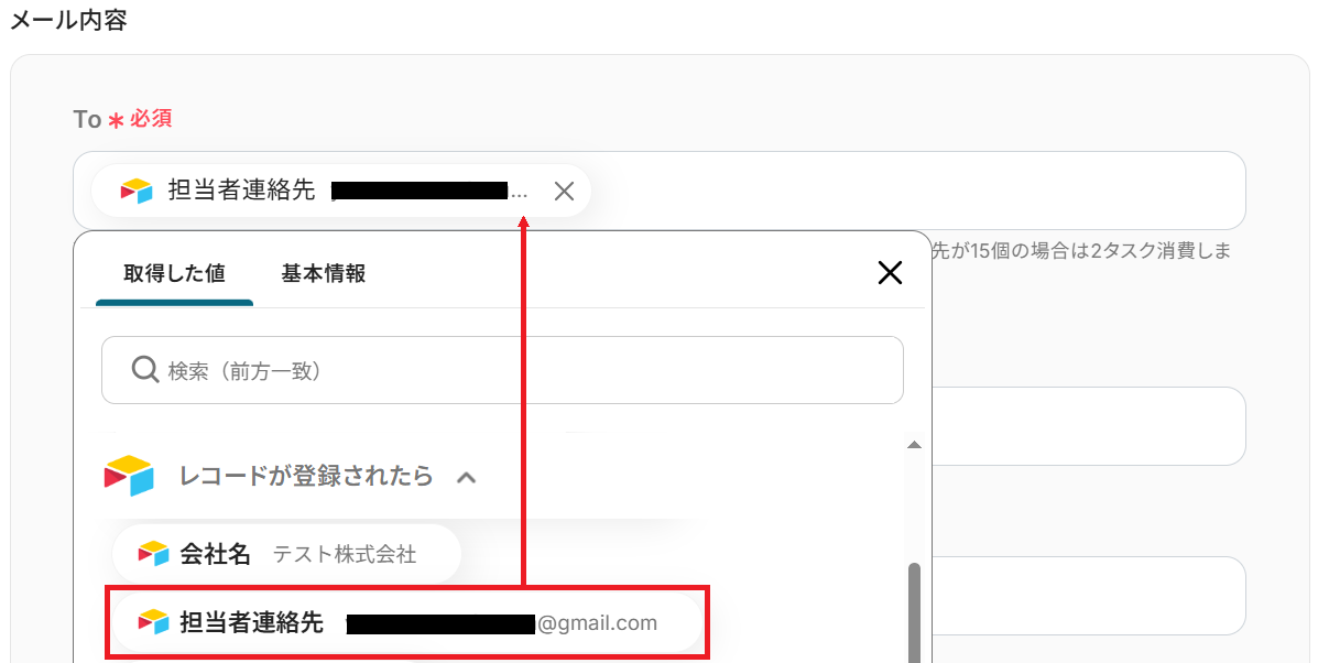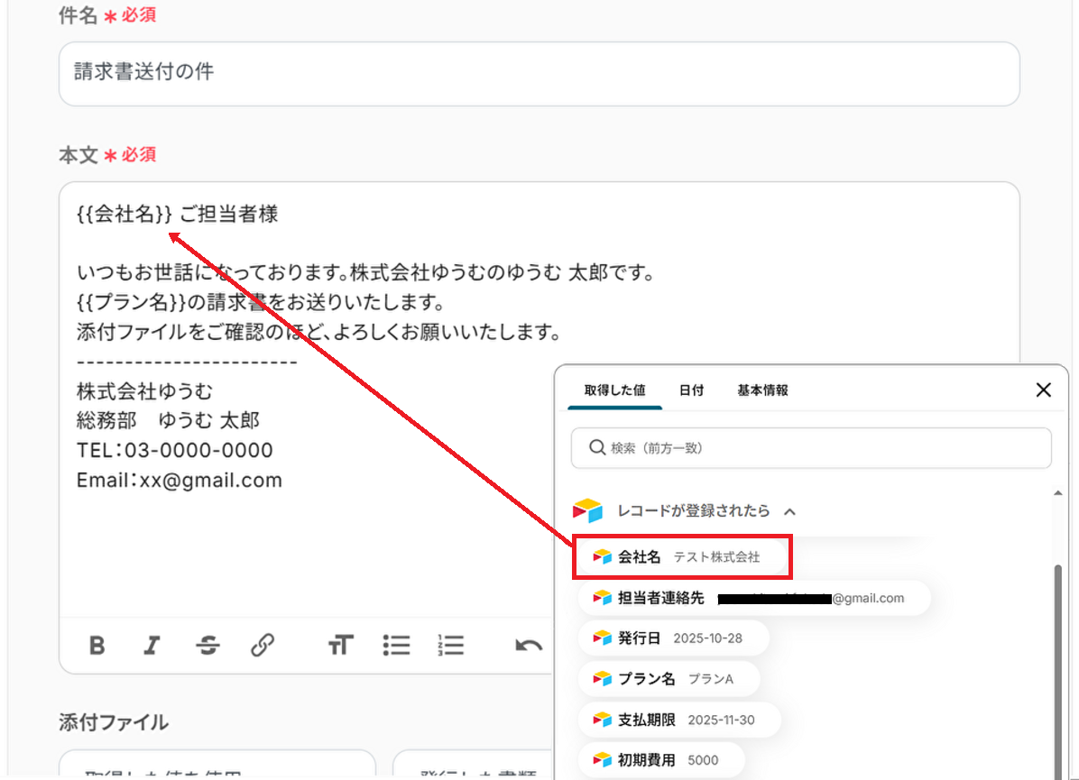 まず、ToにAirtableから取得したメールアドレスの値を入力しましょう。