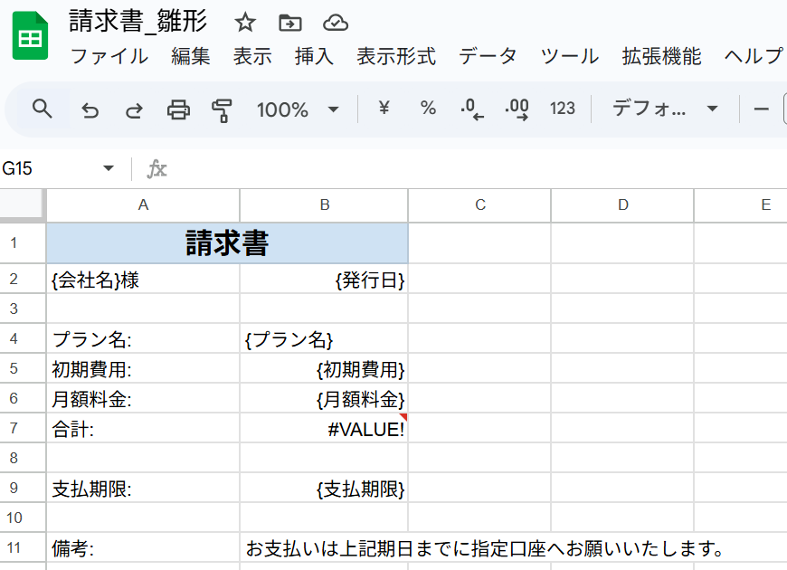 合計金額のセル(B7)は、初期費用(B5)と月額料金(B6)を足した金額になるよう関数を入れており、このあと変数として数字が入ることで正しく表示されます。