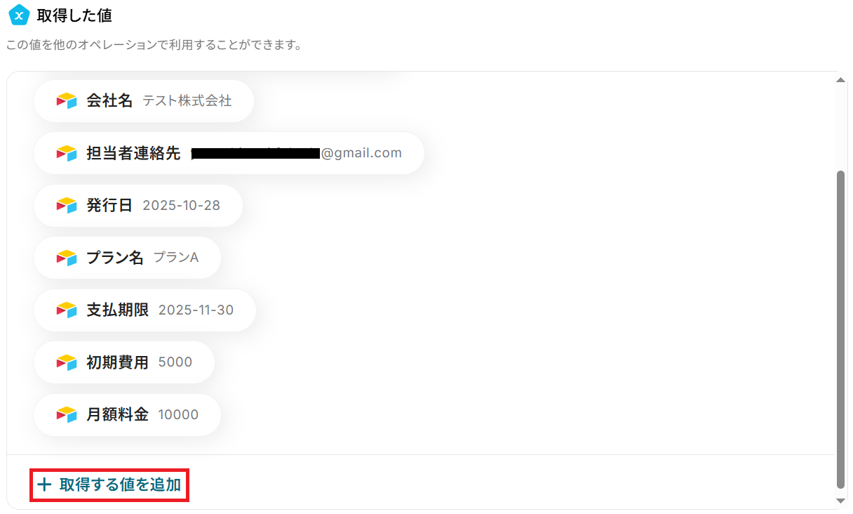その場合「+ 取得する値を追加」から項目を追加できます!