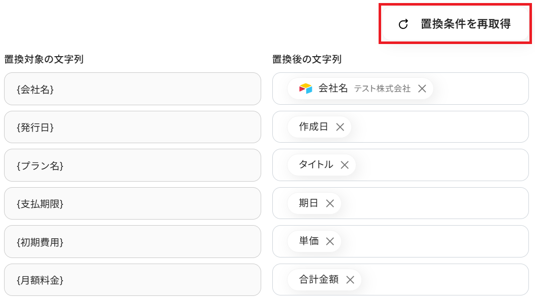 まずデフォルトで置換対象の文字列が並んでいますが、これが雛形の項目と合っていない場合は「↻ 置換条件を再取得」をクリックしてください。