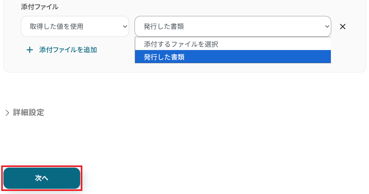 添付ファイルは予め設定されているので、そのまま「次へ」をクリックしましょう。