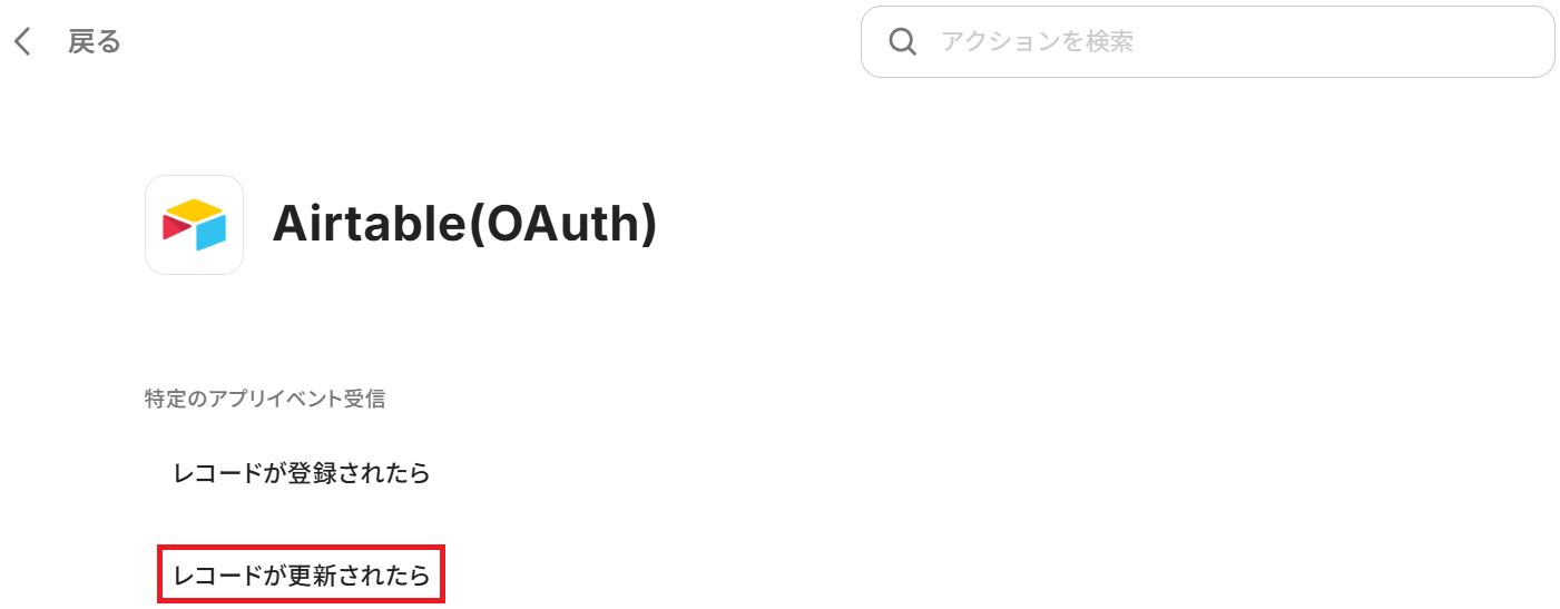 連携アカウントとアクションを選択する画面で、Airtableのアクションを「レコードが更新されたら」に変更してください。