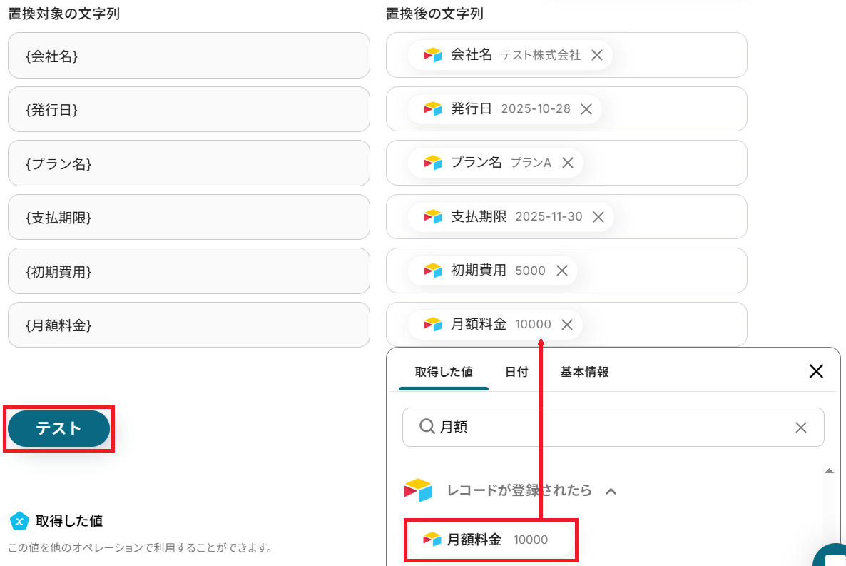 トリガーやオペレーション設定時に「テスト」を実行して取得した値のことです。