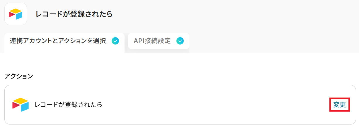 タイトルと連携するアカウント情報を任意で設定し、アクションはテンプレート通りに「レコードが登録されたら」のまま「次へ」をクリック。