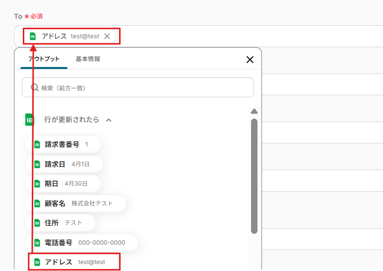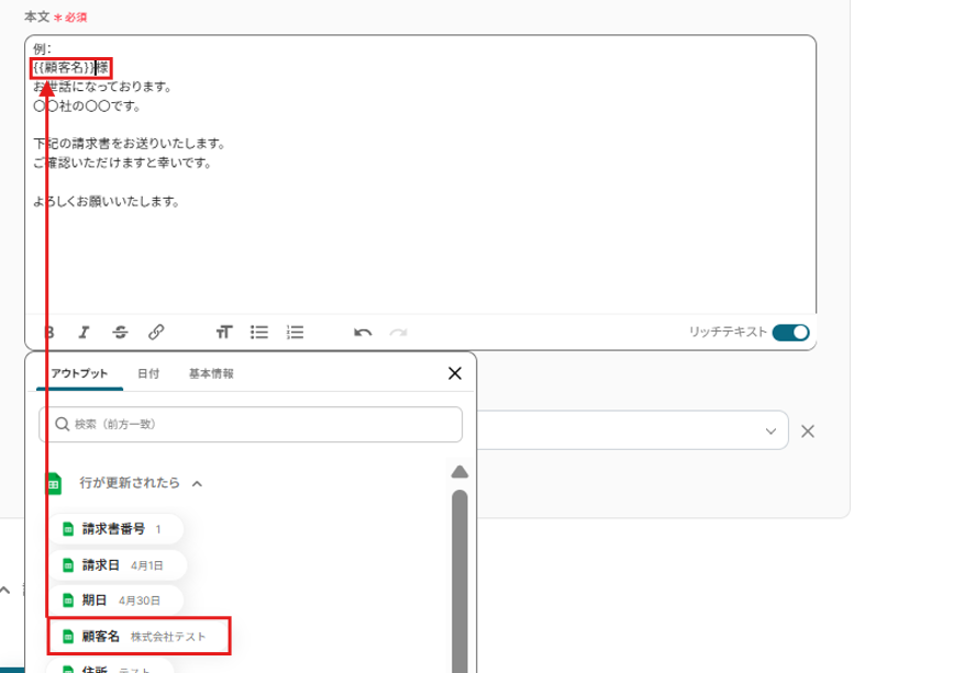 「〇〇様」の部分はアウトプットから顧客名を選択してください。