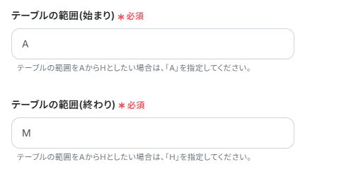 テーブルの範囲は、指定のGoogle スプレッドシートの範囲を選択してください。