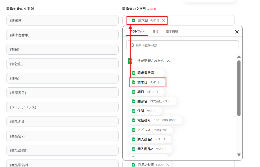 右側の置換対象の文字列に合うアウトプットを置換後の文字列に選択して入力していきます。