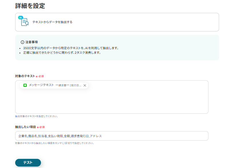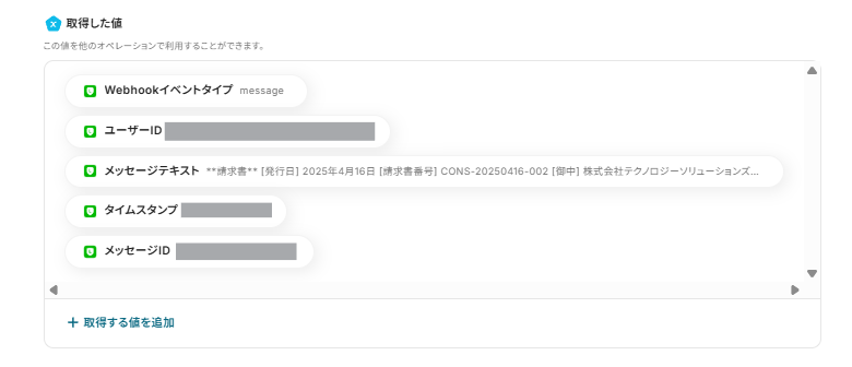 LINE公式アカウントのメッセージ内容から「企業名,商品名,担当者,支払い期限,金額,請求書発行日,アドレス」を取得するよう設定されています。