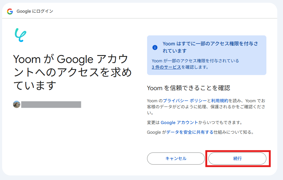 最後にアカウントのアクセスを許可する画面で「続行」をクリックすると、マイアプリの画面に戻ります。