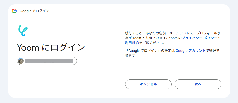 以下の画面のようにYoomにログインを求められるので、「次へ」をクリックします。