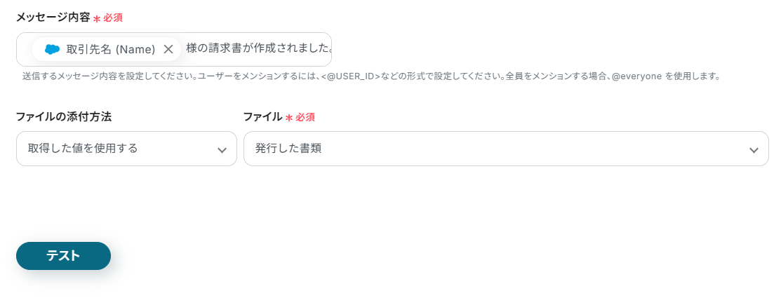 ファイルの添付方法は「発行した書類」になっていることを確認してテストします。