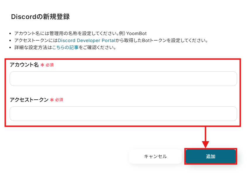 同様にDiscordを選択できたら、先ほど取得した情報を使用して入力後、「追加」をクリックします。
