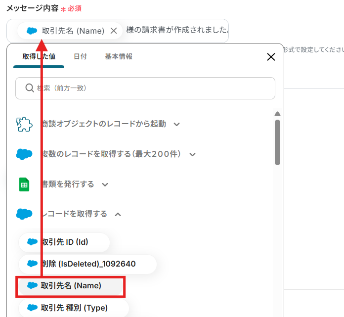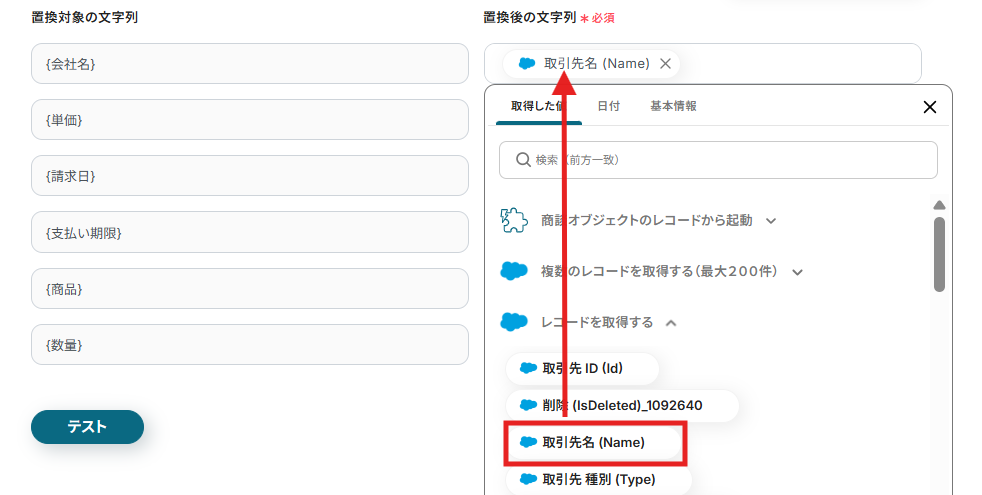 「置換対象の文字列」には作成した請求書の置換部分が記載されているので、「置換後の文字列」にはSalesforceのアウトプットから該当する情報を選択して入力します。