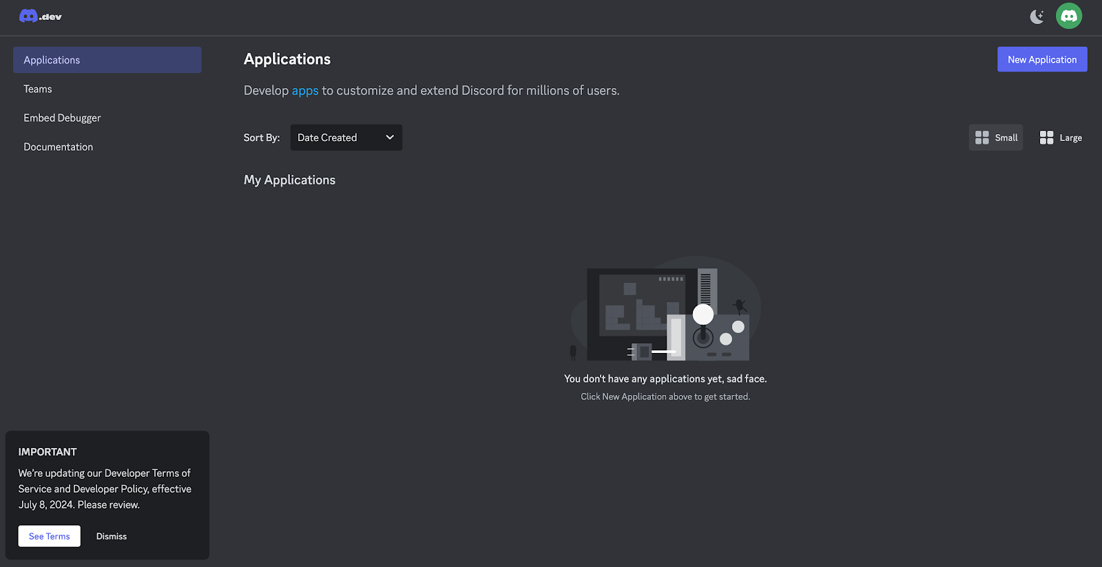 まず、Discord Developer Portalにログインし、右上の「New Application」をクリックします。