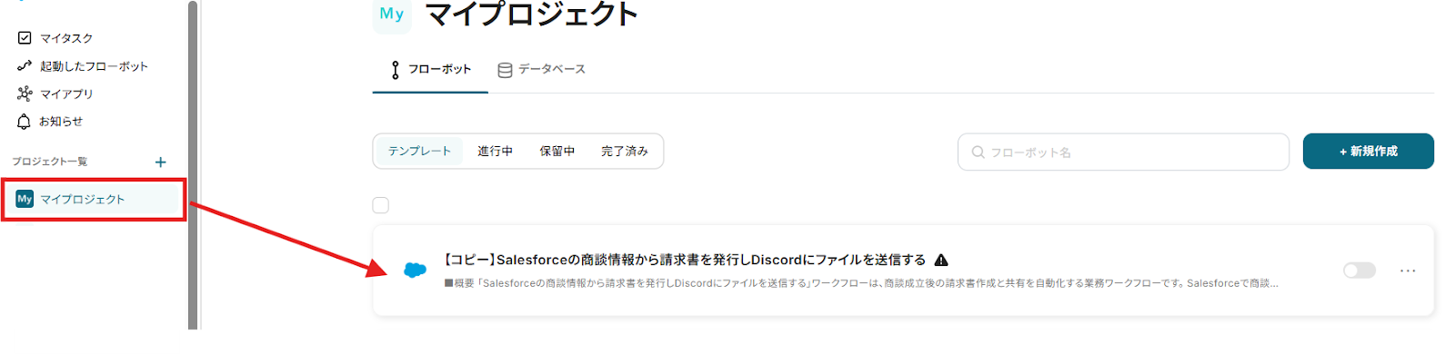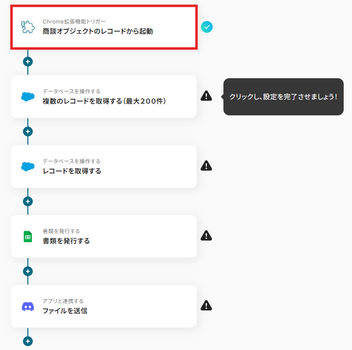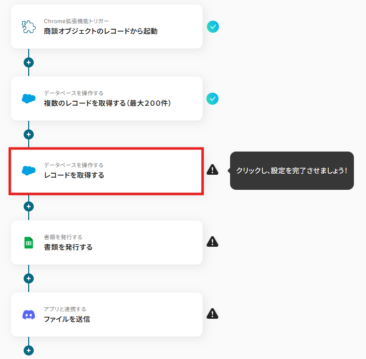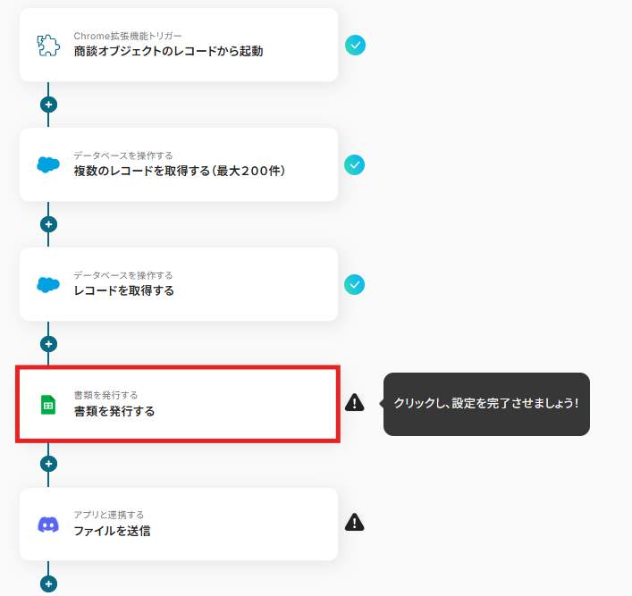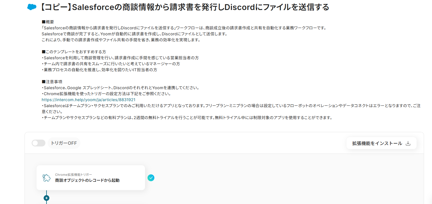 「Salesforceの商談情報から請求書を発行しDiscordにファイルを送信する」ワークフローは、商談成立後の請求書作成と共有を自動化する業務ワークフローです。