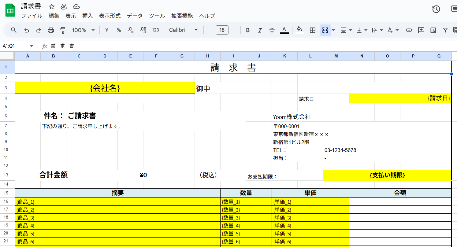 このフローは、情報を基にGoogleスプレッドシートで請求書を作成するため、Googleスプレッドシートの請求書を準備する必要があります。