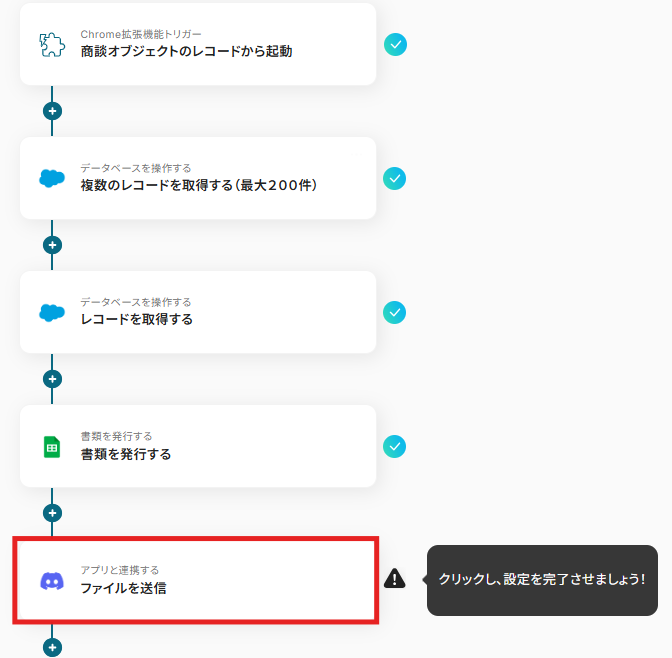 これで【Salesforceの商談情報から請求書を発行しDiscordにファイルを送信する】というフローが完成です。