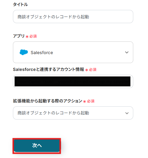 アクションは「商談オブジェクトのレコードから起動」が選択されていることを確認して、「次へ」をクリックします。