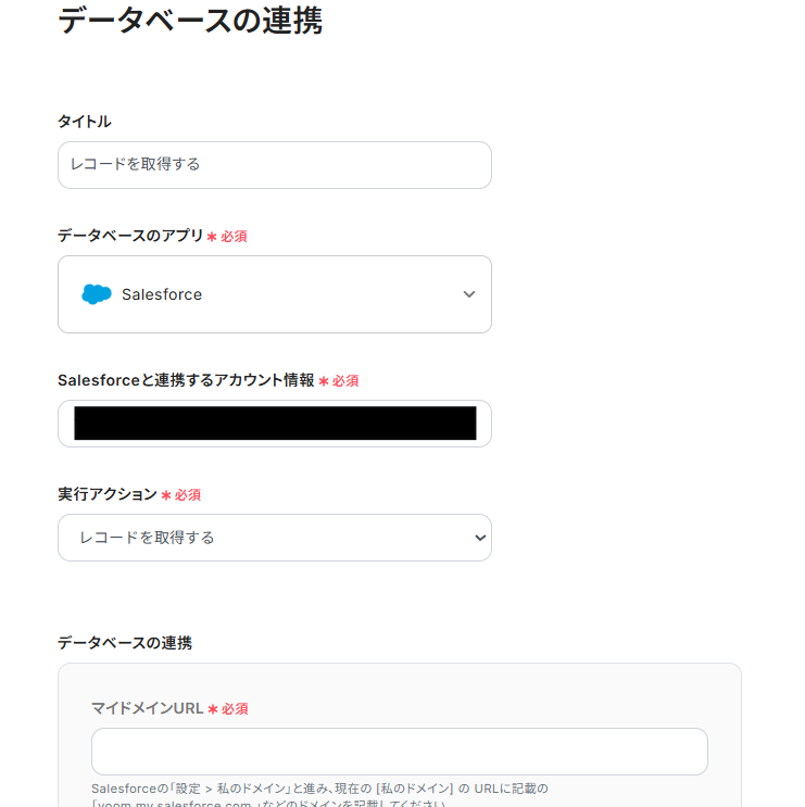 2) アクションは「レコードを取得する」が選択されていることを確認し、マイドメインURLとオブジェクトのAPI参照名を入力して「次へ」をクリックします。