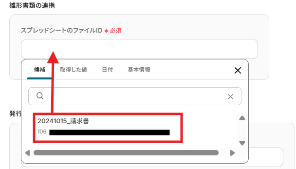 雛形書類の連携はボックスをクリックすると連携済みのIDが表示されるので、事前に用意した請求書のIDを選択してください。