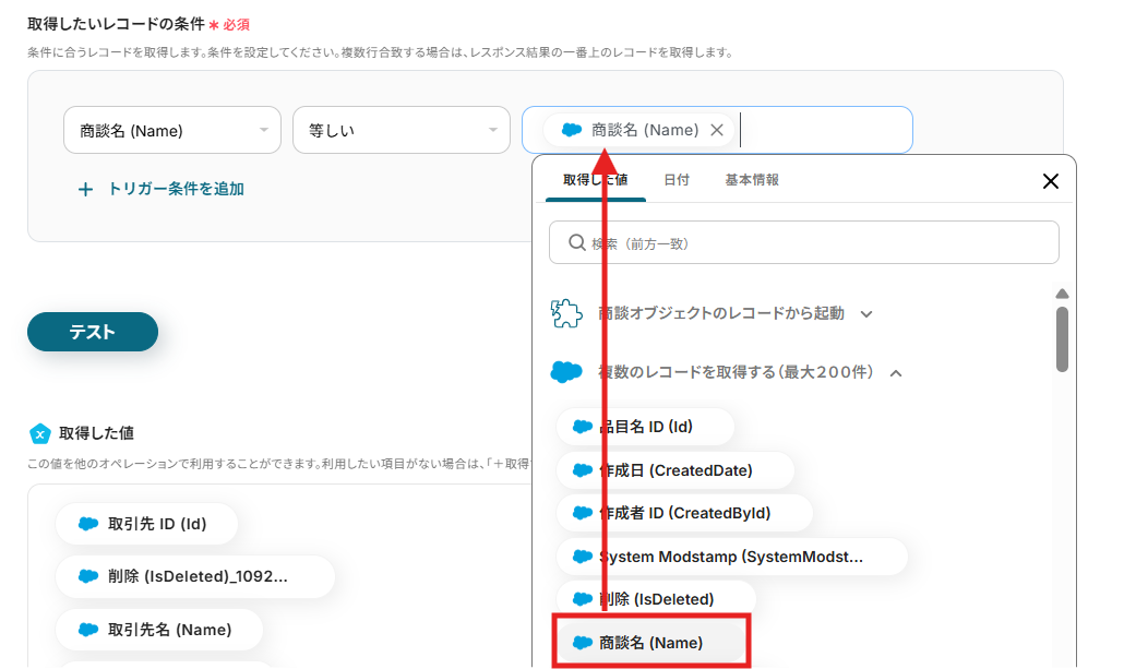 3)ここでは、先ほど取引先で絞った複数のレコードから該当する1つレコードを絞り込みたいので、「商談名 等しい 商談名」となるようにSalesforceのアウトプットから選択します。