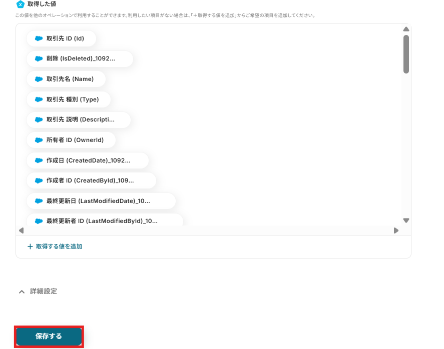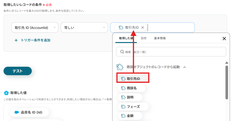 3)ここでは、データベースから該当するレコードを絞り込みたいので、「取引先ID 等しい 取引先ID」となるように先ほど取得したSalesforceのアウトプットから選択します。