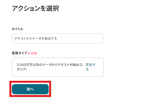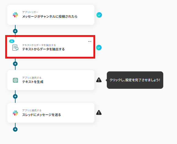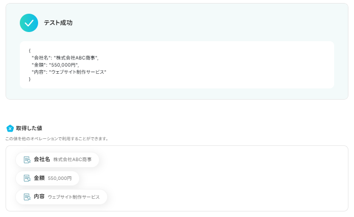 次の設定ではSlackから取得したメッセージ本文から、請求書の草案を作成するために必要な「会社名」「金額」「内容」を抽出するための設定がされています。
