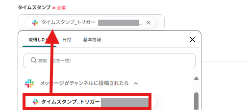 タイムスタンプは以下の画面のように、入力項目の下に表示される「取得した値」から選択しましょう。