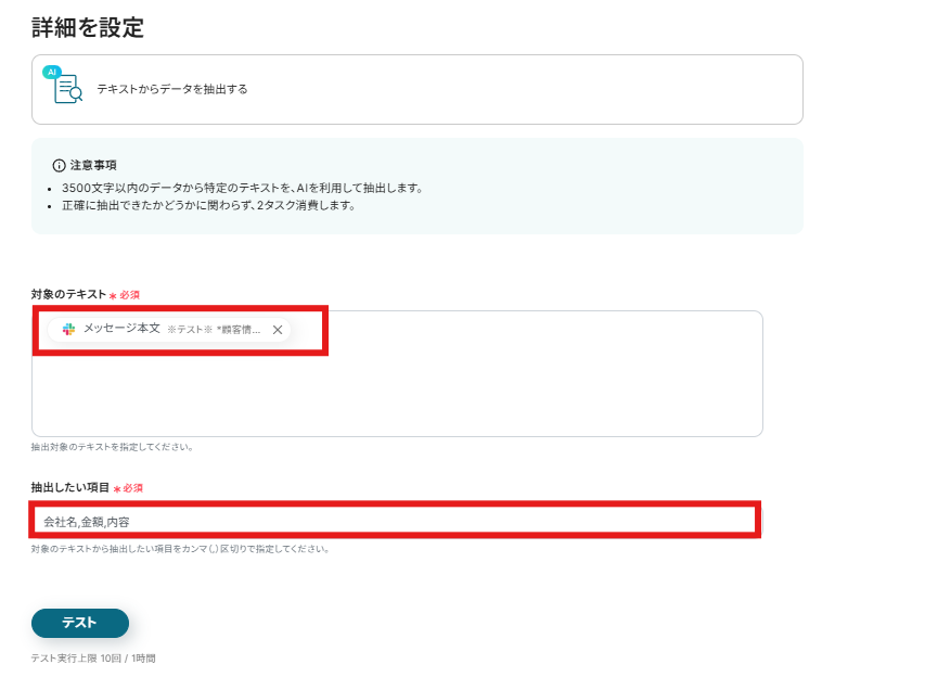 設定ができたら「テスト」をクリックし、実際に抽出できるか確認してみましょう。