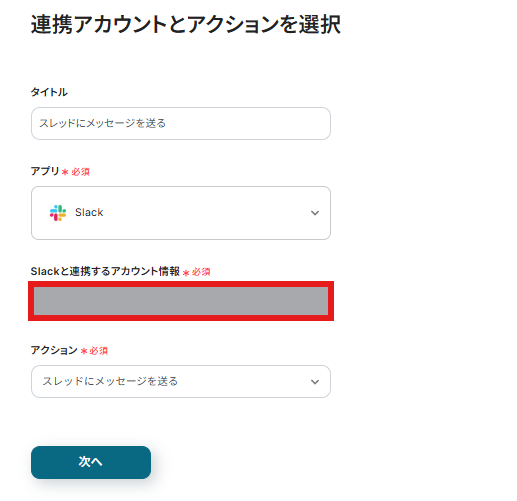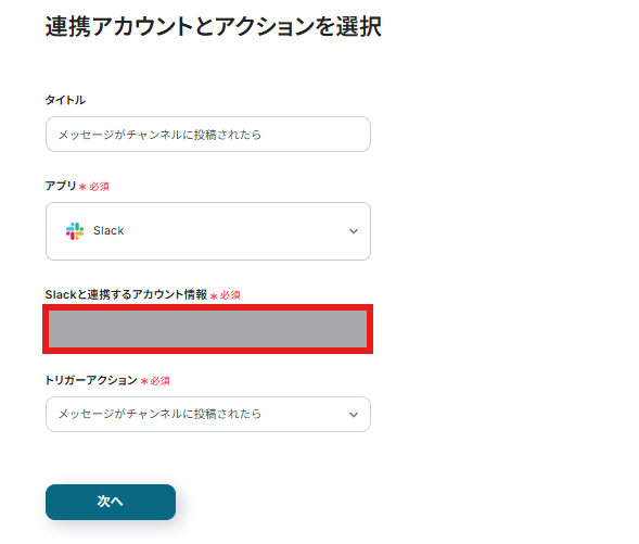 連携アカウントとアクションを選択する画面でSlackのアカウントを再度確認しましょう。