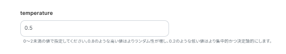 今回は明確で安定した回答を求めるため、temperatureは「0.5」に設定しました。