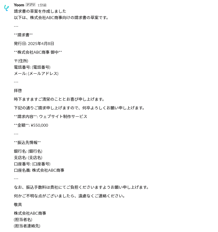日常的にSlackで共有される請求関連情報をYoomが自動的に取得し、ChatGPTがそれを基に請求書の草案を作成します。