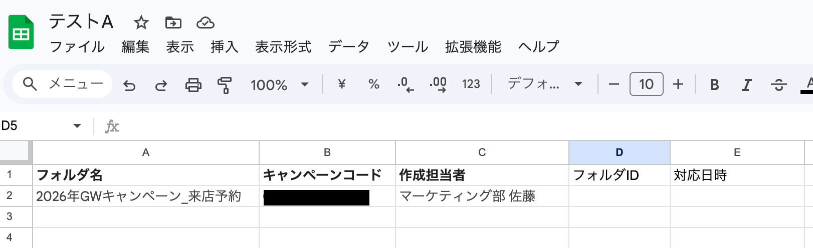 まず今回のテストで利用する、Google スプレッドシートを作成します。