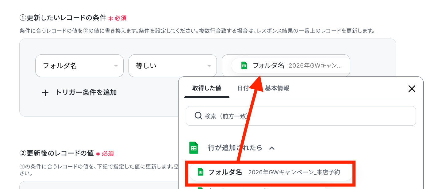 更新したいレコードの条件を設定します!フォルダ名は、ステップ3で取得した値をセットしましょう。