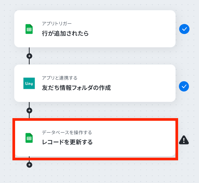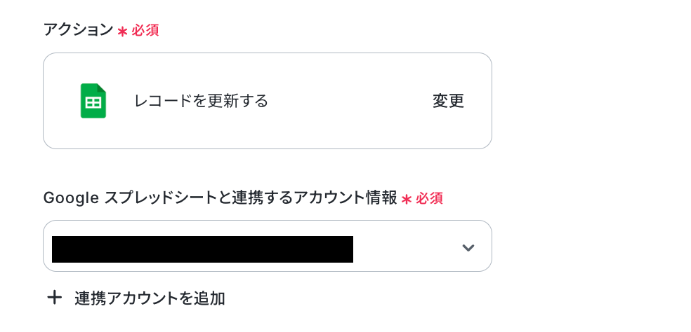 ステップ5:Google スプレッドシートのアクション設定 これまでに取得した値を使用して、Google スプレッドシートのレコードを更新する設定を行います。 最後の赤枠をクリックしましょう!