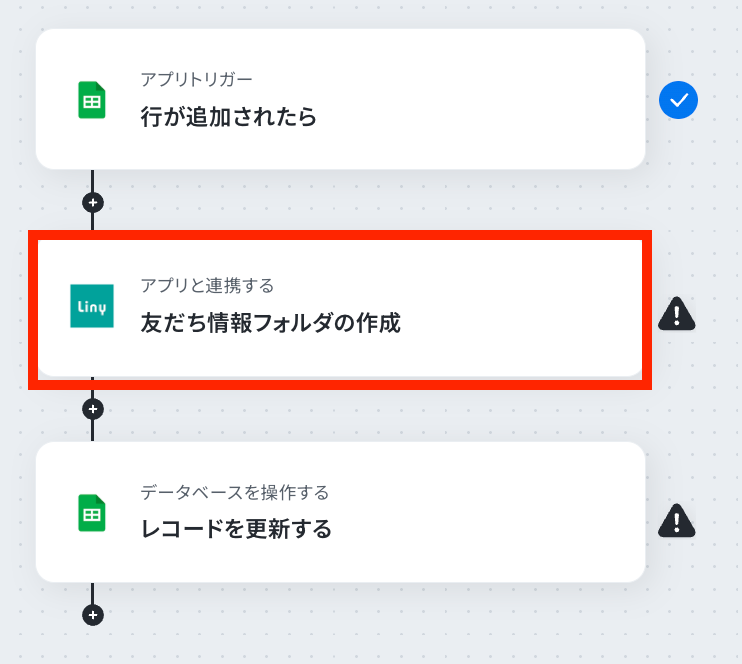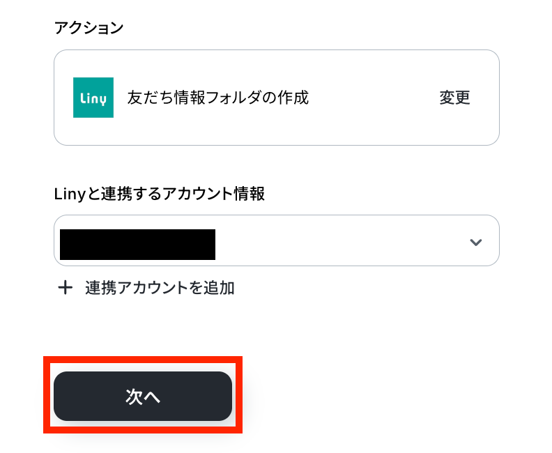 ステップ4:Linyのアクション設定 取得した値を用いて、Liny上に友達情報フォルダを作成する設定を行います。 次の赤枠をクリックしましょう。