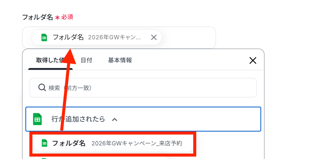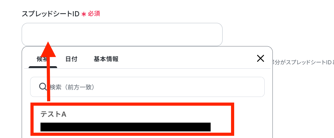 ステップ3と同様に、空欄をクリックして、候補の中からステップ3で連携したGoogle スプレッドシートレコードを選択します。