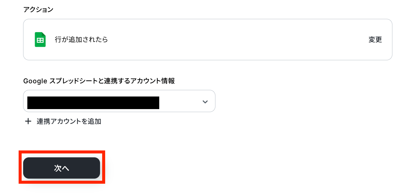 連携するアカウント情報に間違いがないか確認して、問題なければ、アクションはそのままで次の設定へ進みます。