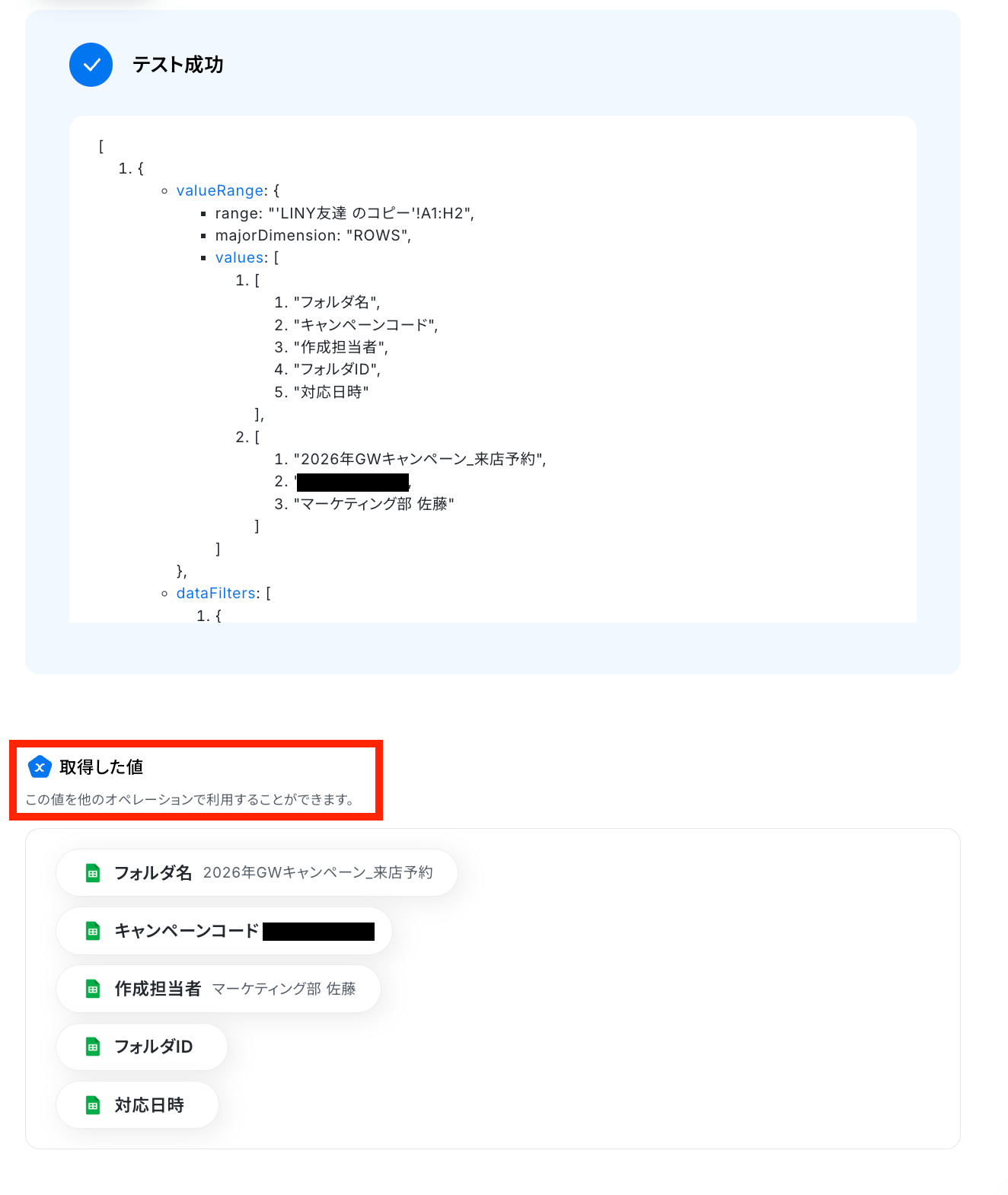 テスト成功で、取得した値 が取得されます。
