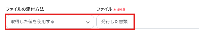 「ファイルの添付方法」は、プルダウンからアウトプット(取得した値)を選択してください。