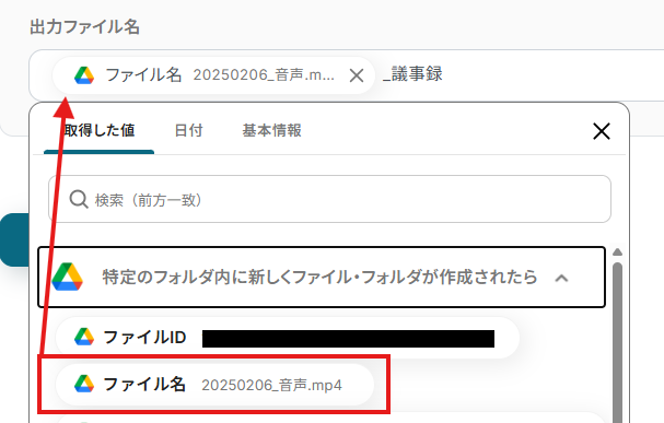 「出力ファイル名」は、入力欄をクリックして表示されるアウトプット(取得した値)から選択できます。
