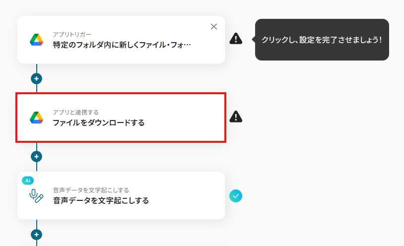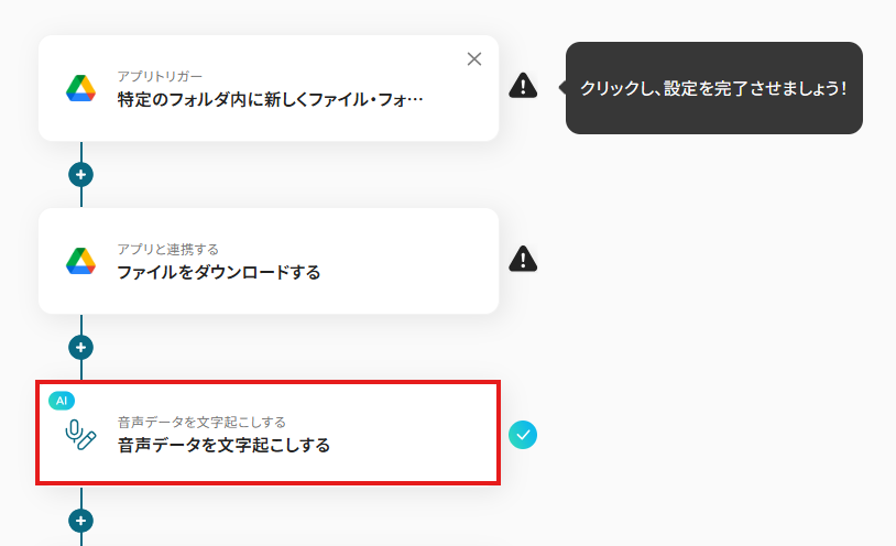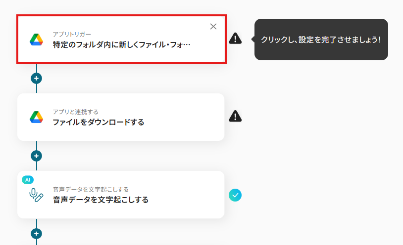 それではここから代表的な例として、Google Driveに音声ファイルがアップロードされた際に、AIが議事録を自動で作成し、その内容をSlackに通知するフローを解説していきます!