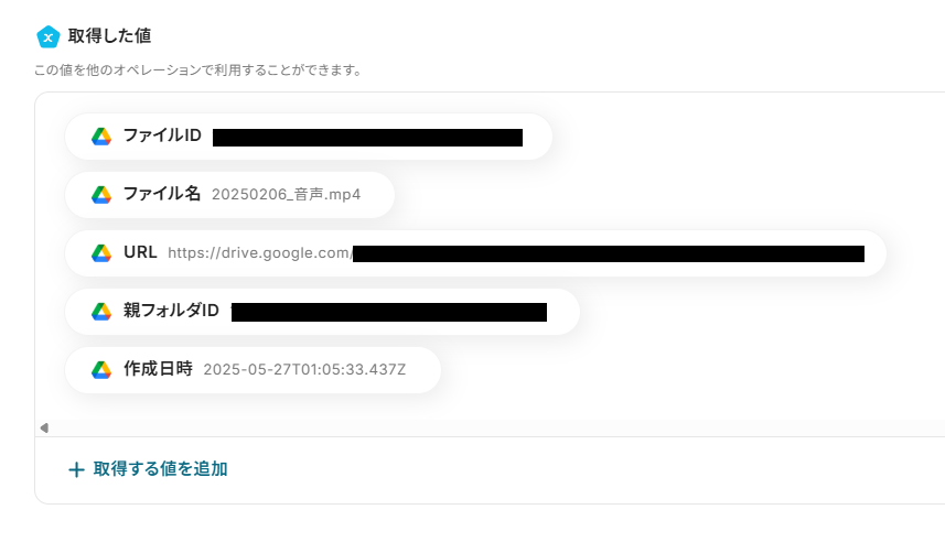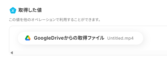 「ファイルID」は、入力欄をクリックして表示されるアウトプット(取得した値)から選択してください。