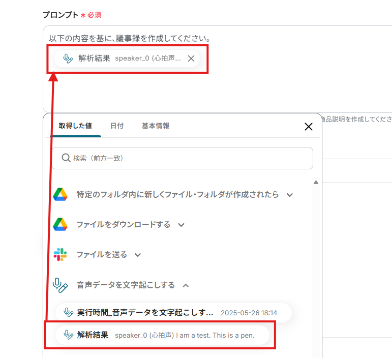 「プロンプト」は、AIへの指示内容を設定します。アウトプット(取得した値)から選択してください。