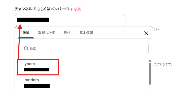 「チャンネルIDもしくはメンバーID」は、入力欄をクリックして表示される候補から選択してください。