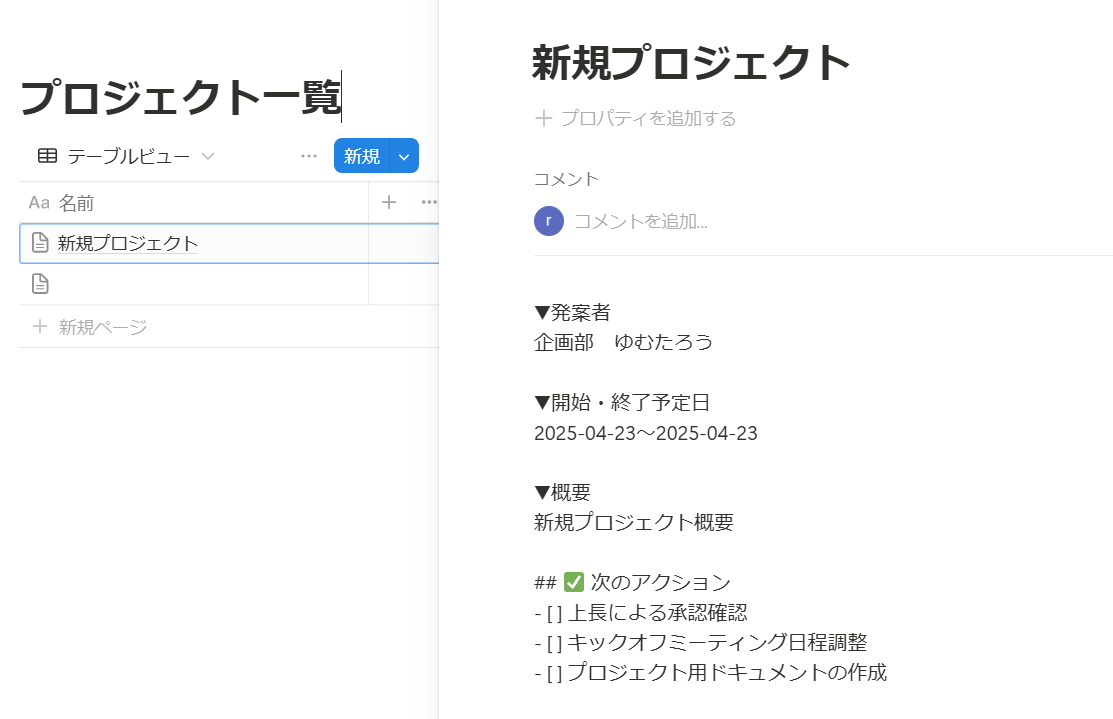 フォームからの入力データを使ってNotion内に統一されたテンプレートページを生成することで、手動でのデータ入力やページ作成の手間が省け、情報管理がスムーズに行えます。