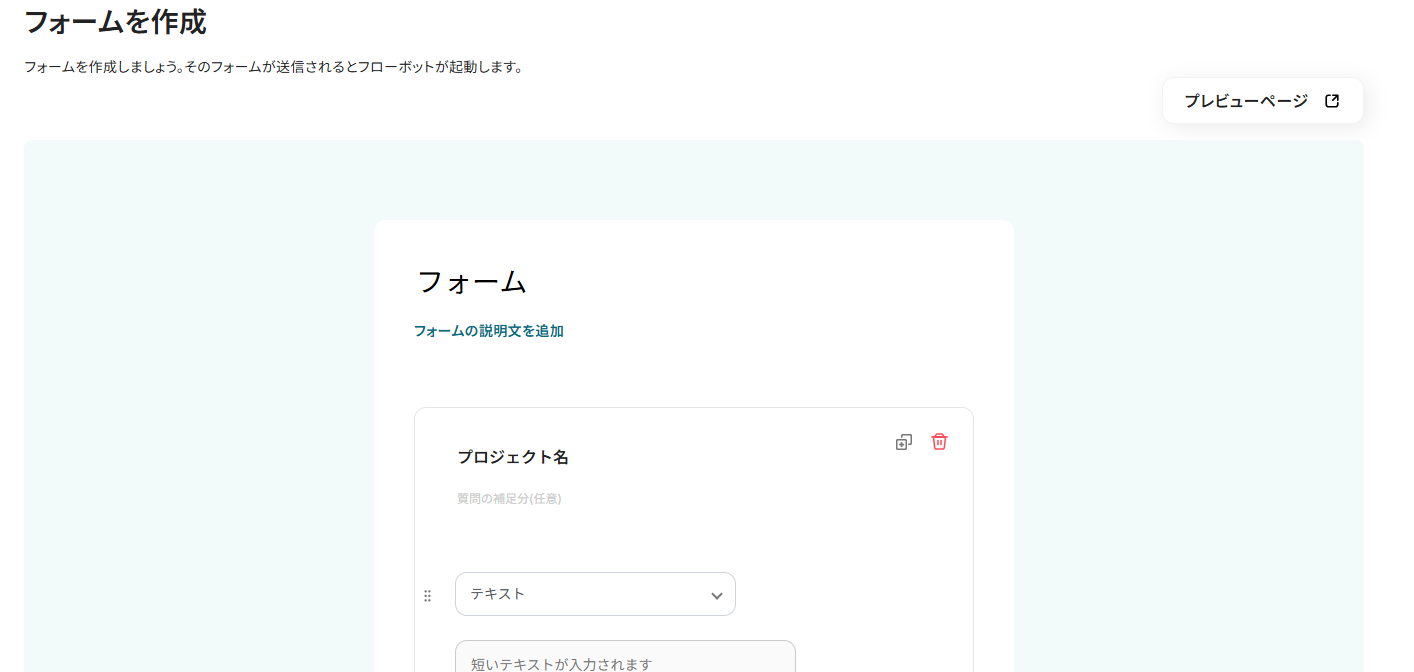 今回は、プロジェクト名・発案者の部署・開始予定・想定終了日・プロジェクト概要を回答してもらうフォームを作成しています。