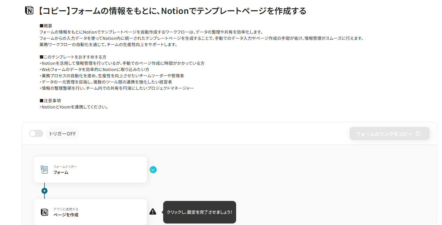 Yoomには、フォーム入力などの情報をもとにNotionのテンプレートページを自動作成するためのテンプレートが用意されています。
